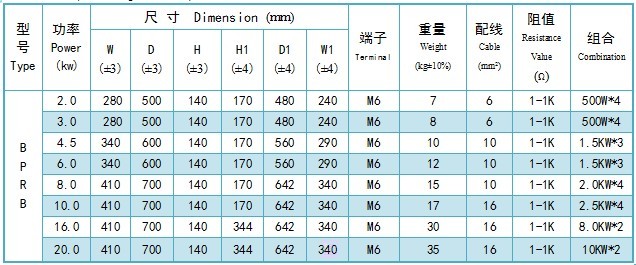 產品特點(Product Features) 1.額定功率范圍:2KW-20KW; 2.額定阻值范圍:1Ω-10KΩ 3.最大工作電壓:2KV; 4.耐壓范圍:AC3KV 50Hz/1min 5.額定溫升:375℃; 6.溫漂范圍:≤400ppm/℃ 7.IP 等級:IP00-IP23; 8.振動:1.5g 9.熱平衡時間常數:1800S 10.載流體材料:0Cr25AL5