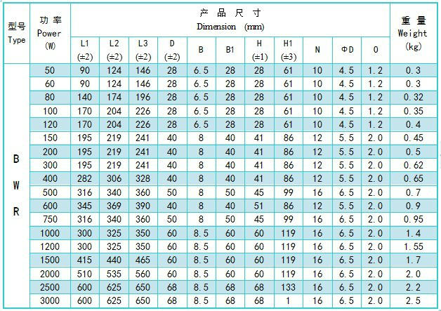產品特點(Product Features) 1.額定功率范圍:50W-2500W 2.最大工作電壓:2KV 3.額定阻值范圍:1R-10KR 4.耐壓范圍:AC3KV 50Hz/1min 5.IP 等級:IP00 6.載流體材料:0Cr25AL5