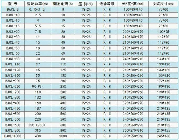 技術參數 (Technical Parameter) 1.額定工作電壓:380V/50Hz或者660V/50Hz 2.額定工作電流:3A至2000A/40℃ 3.抗電強度:鐵芯-繞組3000VAC/50Hz/5mA/10s無飛弧擊穿 4.絕緣電阻:1000VDC絕緣阻值≥100MΩ 5.電抗器噪音:小于65dB(與電抗器水平距離點1米測試) 6.防護等級:IP00 7.絕緣等級:F級以上