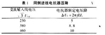四、輸入電抗器容量的選擇 輸入電抗器的容量可按預期在電抗器每相繞組上的壓降來決定。一般選擇壓降為網側相電壓的2%~4%,也可按表1的數據選取。