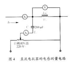 七、電抗器電感量的測定 1.直流電抗器BDCL電感量的測定鐵芯電抗器的電感量和它的工作狀況有很大關系,而且是呈非線性的,所以應盡可能使電抗器處于實際工作條件下進行測量。圖4所示是測量直流電抗器的電路。在電抗器上分別加上直流電流Id與交流電流I~,用電容C=200μF隔開交直流電路,測出LDC兩端的交流電壓U~與交流電流I~,可由式(9)、式(10)式近似計算電感值L。