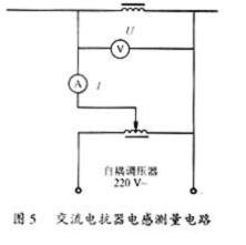 2.交流電抗器電感量的測定帶鐵芯的交流電抗器的電感量不宜用電橋測量,因為測電感電橋的電源頻率一般是采用1000Hz,因此測電感電橋只可用于測量空心電抗器。 對于用硅鋼片疊制而成的交流電抗器,電感量的測量可用工頻電源的交流電壓表——電流表法測量,如圖5所示。通過電抗器的電流可以略小于額定值,為求準確可以用電橋測量電抗器線圈內阻rL,每相電感值可按式(11)計算: