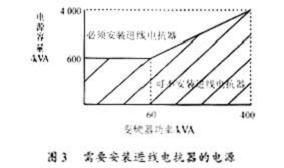 三、需要安裝輸入電抗器的場合 輸入電抗器既能阻止來自電網的干擾,又能減少整流單元產生的諧波電流對電網的污染,當電源容量很大時,更要防止各種過電壓引起的電流沖擊,因為它們對變頻器內整流二極管和濾波電容器都是有害的。因此接入輸入電抗器,對改善變頻器的運行狀況是有好處的。根據運行經驗,在下列場合一定要安裝輸入電抗器,才能保證變頻器可靠的運行。 1.電源容量為600kVA及以上,且變頻器安裝位置離大容量電源在10m以內,如圖3所示: