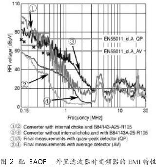 在這個例子中,變頻器配有50 m長的線纜。測試記錄清楚的表明內部濾波器的線圈飽和,發出了嗡嗡的讓人煩躁的噪聲,因此必須配置外置濾波器來保證重新滿足EMC 限值的要求。相應的配有外置濾波器,電機功率11 kW屏蔽線纜長度為50 m 的變頻器的EMI 測試曲線如圖2 所示。其中型號為BAOF超緊湊、低成本濾波器在此應用中被使用。