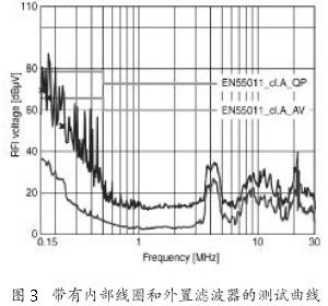 乍看之下,在頻率從幾百kHz 到3 MHz 的范圍內,配有內置線圈的測試曲線令人驚訝。這是因為共模扼流圈,其電感量由其鐵氧體材料決定,不僅抑制共模干擾,而且具有非常低的漏感(漏感是由于部分磁場穿過空氣而不是鐵氧體介質所產生的)。這部分漏感并沒有受到線圈飽和的影響而繼續存在,但是它對其他因線圈飽和而超過限值的頻段幾乎毫無幫助。如果同一個變頻器使用同樣型號為BAOF的濾波器,但是去掉變頻器內部扼流圈,結果顯示就如圖2,這樣更容易滿足限值。