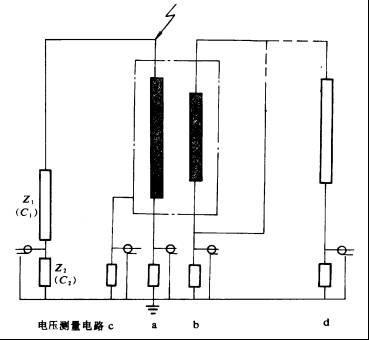 圖3 雷電沖擊試驗中的端子接線和故障探測方法 a—中性點電流;b—電容傳遞電流;c—油箱電流;d—傳遞電壓 變壓器雷電沖擊試驗時,試品端子接線,在GB 1094.3—85中已有較詳細的敘述,至于電抗器則可參見關于電抗器的相應標準中的規定。通常非試繞組所有端子及被試繞組的非試端子,均應接地。但是,為了改善半值時間T2,有時則采用特殊接線(參見本導則第4章和6.1條)。 當分接繞組,繞組的某一部分或增壓變壓器的串聯繞組是用避雷器保護時,在試驗時,建議用電阻代替避雷器,電阻值的大小應使制動電阻上的電壓值與避雷器保護水平相接近。試品的接地方式,主要由所采用的故障探測方法決定。通常是采用記錄施加電壓和下述瞬變現象的波形圖來探測故障,參見圖3,一般地說,在正常試驗中只需記錄施加電壓波形和其中任一個瞬變現象波形。 a.中性點電流,即通過被試繞組的電流,由被試繞組的接地端引出; b.電容傳遞電流:即傳遞到鄰近繞組的電流; c.油箱電流:即傳遞到油箱上的電流; d.傳遞到非試繞組上的電壓。 a 、b.和c.的總和稱為“線電流”。電抗器試驗時,方法b.和方法d.是不適用的;方法c.因靈敏度比其它方法低,僅作為一種輔助的瞬變現象記錄方法。 |