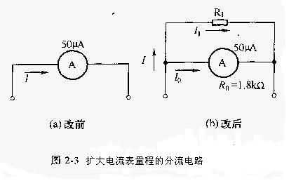 電流表的滿度電流為50uA.現需將它改成一個最大量程為500uA的電流表,此時只需要在電流表兩端并上一只制動電阻R1即可。根據圖2-3(b)并聯電路可知: I= I1 +I0 若I = 500uA,則I1 =I - I0 = 500-50 =450uA由于I0 * R0 =I1* R1(式中R0為電流表內阻) 求得R1= (I0* R0)/I1= 200Ω上述的分流電路計算結果表明,只要在50uA表頭上并聯一個200Ω的電阻,即可使表頭的量程由50uA擴大到500uA。