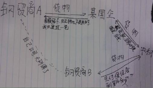 至于公告里提的第二部分都不用說了,這種交易實際就是中材以鋼材貿易的形式將貨款支付給鋼貿商名下的A公司,形式為采購鋼材。到期之后再將這批鋼材賣給該鋼貿商名下的B公司。其中差價為這次交易中材的毛利潤。而錢先付出去了,原本應該由A公司將貨轉給中材,但由于各種原因一直沒給,所以才導致了“貨物去向不明”電抗器作用。 本人稍微了解一點中材的做法,實際上中材名下的貨一直是由“中遠物流”來監管的。(呵呵,又是一個中字頭的大公司),真的貨物丟了,你去找監管公司賠就是了。而中材有時候為了謹慎起見,更或者是下面的操作人員為了更好的向上級部門匯報,要求付款單位不能是該鋼貿商名下的A公司,而是要求是資歷更好的大企業,甚至是央企業。 但這也不難辦,該鋼貿商再找另一家央企就是嘍,過把賬留點利潤給它也不是難辦的事情。于是這個貨物就這樣流轉了: