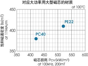 在支持大功率用大型磁芯的鐵氧體類別上,高飽和磁通密度為430mT,迫近以擁有行業最高水平的飽和磁通密度為榮的PC33的飽和磁通密度到達點; 同時磁芯損耗僅為400Kw/m3,低于低損耗材料PC40。尤其是降低磁芯損耗23%,這一成果為串聯電抗器與進線電抗器設計賦予了前所未有的富裕度,是一個巨大的飛躍。