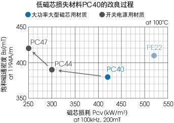 其最初的成果見上圖所示的開發過程,是為響應開關電源的最尖端需求而著手的PC40至PC47。現在,這一系列的磁芯損耗已達到大約40%以下的250kW/m3,飽和磁通密度也達到超過高飽和磁通密度材料PE22的420mT。