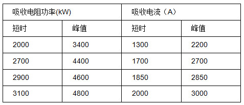 3、吸收制動電阻柜/電阻箱 3.1主要技術參數 額定工作電壓:DC1500V;最高工作電壓:1800V 制動電阻容量及過載能力根據輸出功率的大小如表2所示。在表2中,短時工況定義為持續時間20s,周期120s。 再生制動吸收電阻按多相設置,允許偏差為-5%~+7% 電阻器的最高工作溫度:≤300℃ 冷卻方式:空氣自然冷卻 工作制:間隙工作制 電阻材料:Ni—Cr非磁性材料,電阻值溫漂變化小 單體電阻允許偏差:-5%~+7%