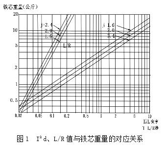 3.1先算出 I²d/L的數值(單位為安/亨),再根據電流的大小選定通過線圈的電流密度 j(單位為A/mm²),在圖1中查出對應的鐵芯重量公斤數,并求出大致的L/R值,即電抗器本身的時間常數T=L/R值。一個電抗器的尺寸大小與導線線徑、圈數、甚至L的大小等均無直接關系,主要取決于容量的大小。