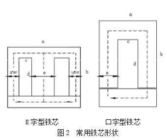 3.2確定鐵芯的形狀和尺寸。 將鐵芯設計為如圖2所示的E字型或口字型形狀,圖中帶箭頭虛線表示計算磁路。鐵芯其磁路平均長度l(cm)、鐵芯截面積S(cm²)和鐵芯的重量有如下關系:T =(ab –2cd)×f×7.8 式中:T為鐵芯重量a;b;c;d ;e為鐵芯各部尺寸(見圖2);f 為鐵芯疊厚。