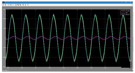 仿真結果: 1)變壓器二次側的并網電流沖擊大概在55A,電壓壓降150V左右,滿足并網要求; 2)當模型采用有功電流和無功電流共同輸出時,有功電流在滿足額定電流情況下,補償部分的無功支撐電壓,可以達到滿載運行的目的; 3)測試平臺可以滿足在額定電流范圍內各個功率段的滿載測試。