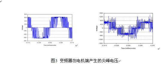 3、變頻器損傷電機定子繞組的機理 脈沖電壓在電纜上傳輸時,如果電纜的電抗器阻抗與負載的阻抗不匹配,在負載端會產生反射。反射的結果是,入射波與反射波疊加,形成更高的電壓,它的幅度最大可以達到直流母線電壓的2倍,大約相當于變頻器輸入電壓的3倍,如圖3所示。過高的尖峰電壓加在電機定子的電抗器上,對線圈造成電壓沖擊,頻繁的過電壓沖擊會導致電機過早失效。