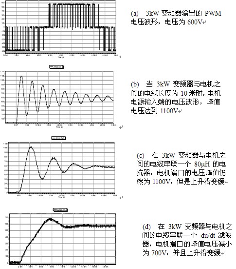 2)在變頻器的輸出端安裝dv/dt濾波器:這個措施適用于電纜長度小于300米的場合,價格略高于電抗器,但是效果有了明顯的改善,如圖6(d)所示。