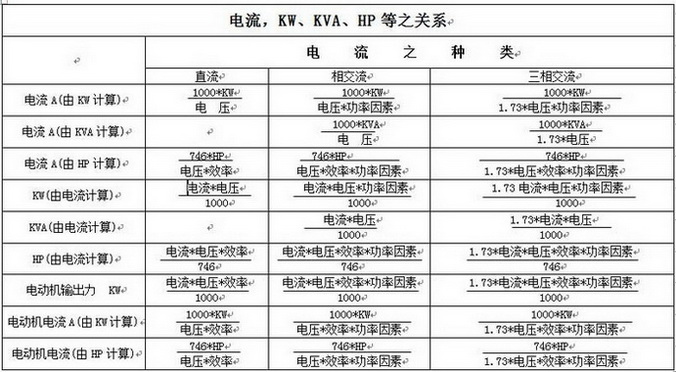 四、附圖:電流、KW、KVA、HP(匹,1hp=0.746KW)等之關系