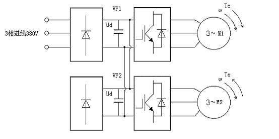 圖三 共用直流母線的回饋制動(dòng)方式 圖三接線是典型的共用直流母線的制動(dòng)方式,M1是處于電動(dòng)狀態(tài),M2經(jīng)常處于發(fā)電狀態(tài),三相交流電源380V接到處于電動(dòng)狀態(tài)的電機(jī)M1上的變頻器VF1端,而VF2則通過共用直流母線方式與VF1的母線相連。在此種方式下,VF2僅做為逆變器在使用,M2處于電動(dòng)時(shí),所需能量由交流電網(wǎng)通過VF1的整流橋獲得;M2處于發(fā)電時(shí),反饋能量通過直流母線由M2的電動(dòng)狀態(tài)消耗。