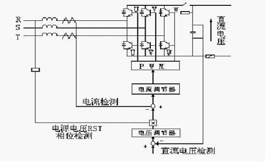 圖四 回饋電網(wǎng)制動(dòng)原理圖 圖四所示為回饋電網(wǎng)制動(dòng)原理圖,它采用了電流追蹤型PWM整流器,這樣就容易實(shí)現(xiàn)功率的雙向流動(dòng),且具有很快的動(dòng)態(tài)響應(yīng)速度。同時(shí),這樣的拓?fù)浣Y(jié)構(gòu)使得我們能夠完全控制交流側(cè)和直流側(cè)之間的無功和有功的交換。