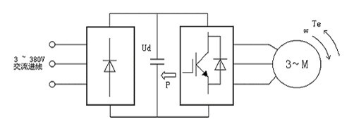 圖一 變頻器調(diào)速系統(tǒng)的二種運(yùn)行狀態(tài) 圖一所示為變頻器調(diào)速系統(tǒng)的二種運(yùn)行狀態(tài),即電動(dòng)和發(fā)電。在變頻調(diào)速系統(tǒng)中,電機(jī)的降速和停機(jī)是通過逐漸減小頻率來實(shí)現(xiàn)的,在頻率減小的瞬間,電機(jī)的同步轉(zhuǎn)速隨之下降,而由于機(jī)械慣性的原因,電機(jī)的轉(zhuǎn)子轉(zhuǎn)速未變。當(dāng)同步轉(zhuǎn)速w1小于轉(zhuǎn)子轉(zhuǎn)速w時(shí),轉(zhuǎn)子電流的相位幾乎改變了180度,電機(jī)從電動(dòng)狀態(tài)變?yōu)榘l(fā)電狀態(tài);與此同時(shí),電機(jī)軸上的轉(zhuǎn)矩變成了制動(dòng)轉(zhuǎn)矩Te,使電機(jī)的轉(zhuǎn)速迅速下降,電機(jī)處于再生制動(dòng)狀態(tài)。電機(jī)再生的電能P經(jīng)續(xù)流二極管全波整流后反饋到直流電路。由于直流電路的電能無法通過整流橋回饋到電網(wǎng),僅靠變頻器本身的電容吸收,雖然其他部分能消耗電能,但電容仍有短時(shí)間的電荷堆積,形成“泵升電壓”,使直流電壓Ud升高。過高的直流電壓將使各部分器件受到損害。 因此,對(duì)于負(fù)載處于發(fā)電制動(dòng)狀態(tài)中必須采取必需的措施處理這部分再生能量。本文闡述的就是處理再生能量的方法:能耗制動(dòng)和回饋制動(dòng)。
